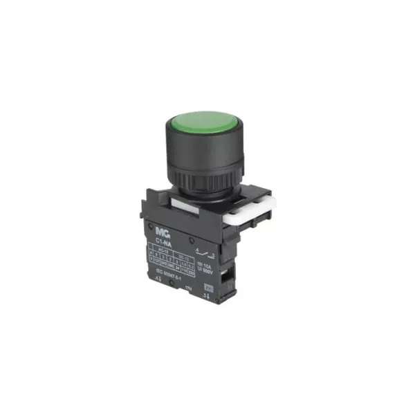 O botão faceado simples, também conhecido como botão pulsador ou botão sem retenção, é geralmente usado no em circuitos de comandos com contatores.
