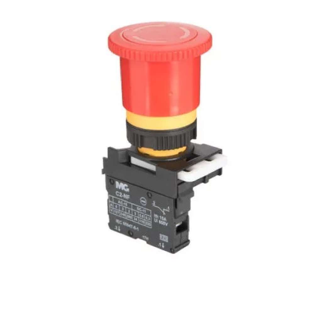 O botão cogumelo de emergência ou botão de emergência, é usado para desligar o comando em caso de alguma anormalidade.