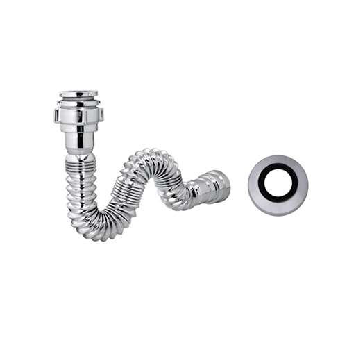 Sifão Sanfonado Universal Metalizado com Canopla. Adapta-se a qualquer saída de válvula de pia e a qualquer tubulação de esgoto. Seus diferentes comprimentos são suficientes para suprir os problemas de instalação presentes em residências.