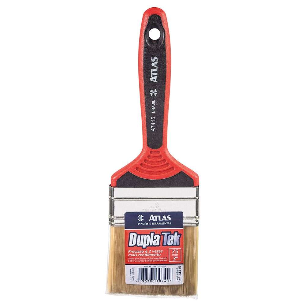 Trincha Dupla de cerdas sintéticas com tecnologia Plumatek de fios formato estrelado. Melhor acabamento, maior durabilidade e recortes mais precisos para todo o tipo de tinta.